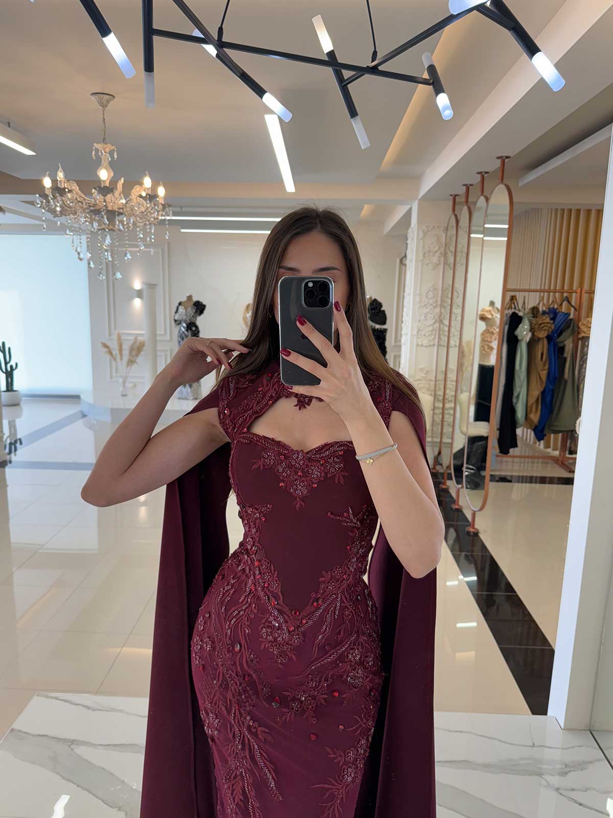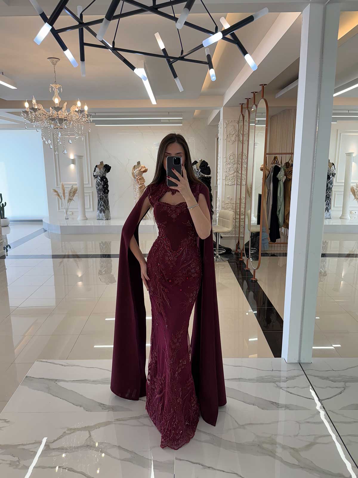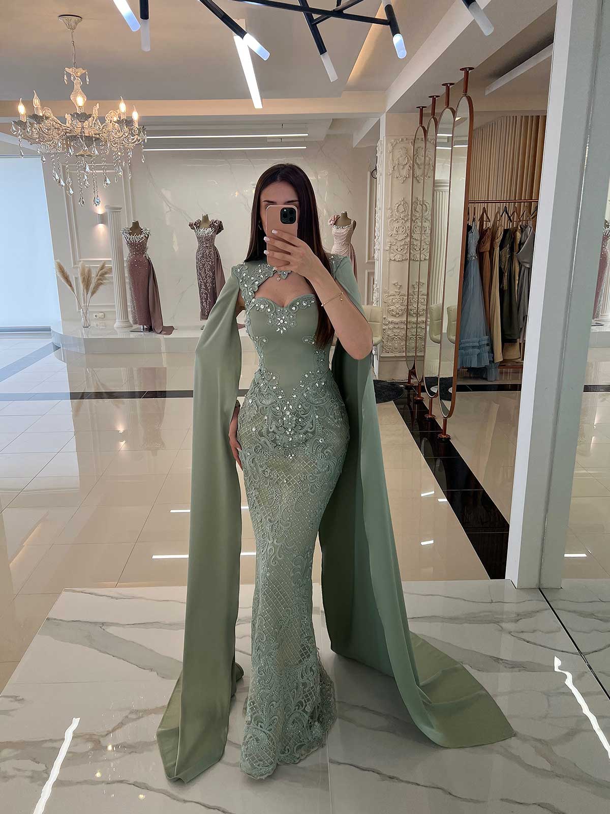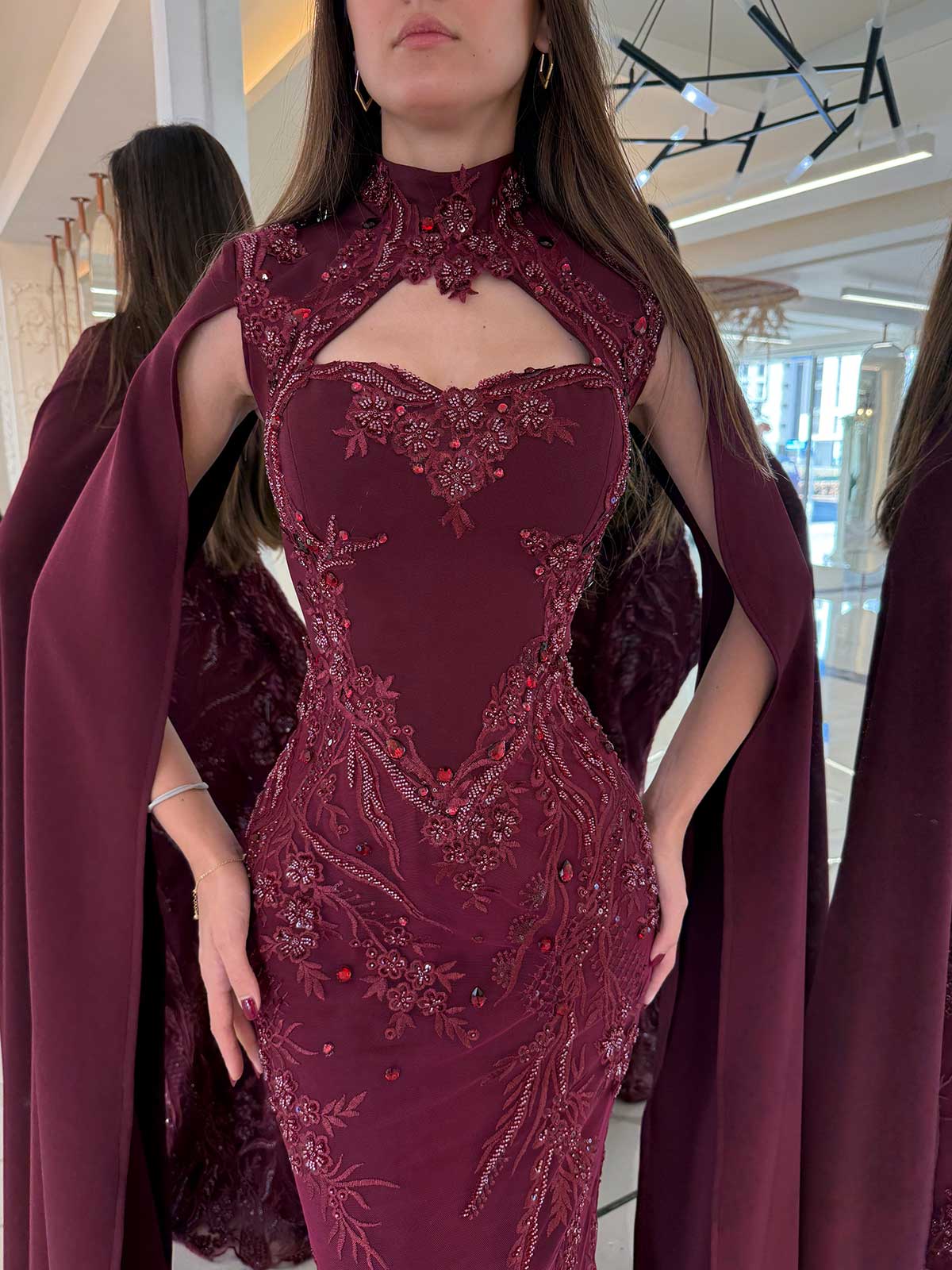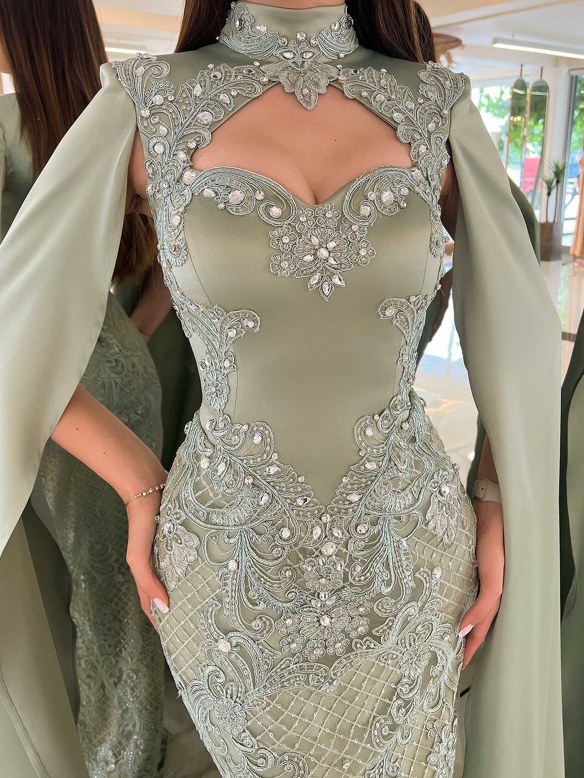 Turtle neck with open chest, mermaid style embroidered dress with two cape sleeves.