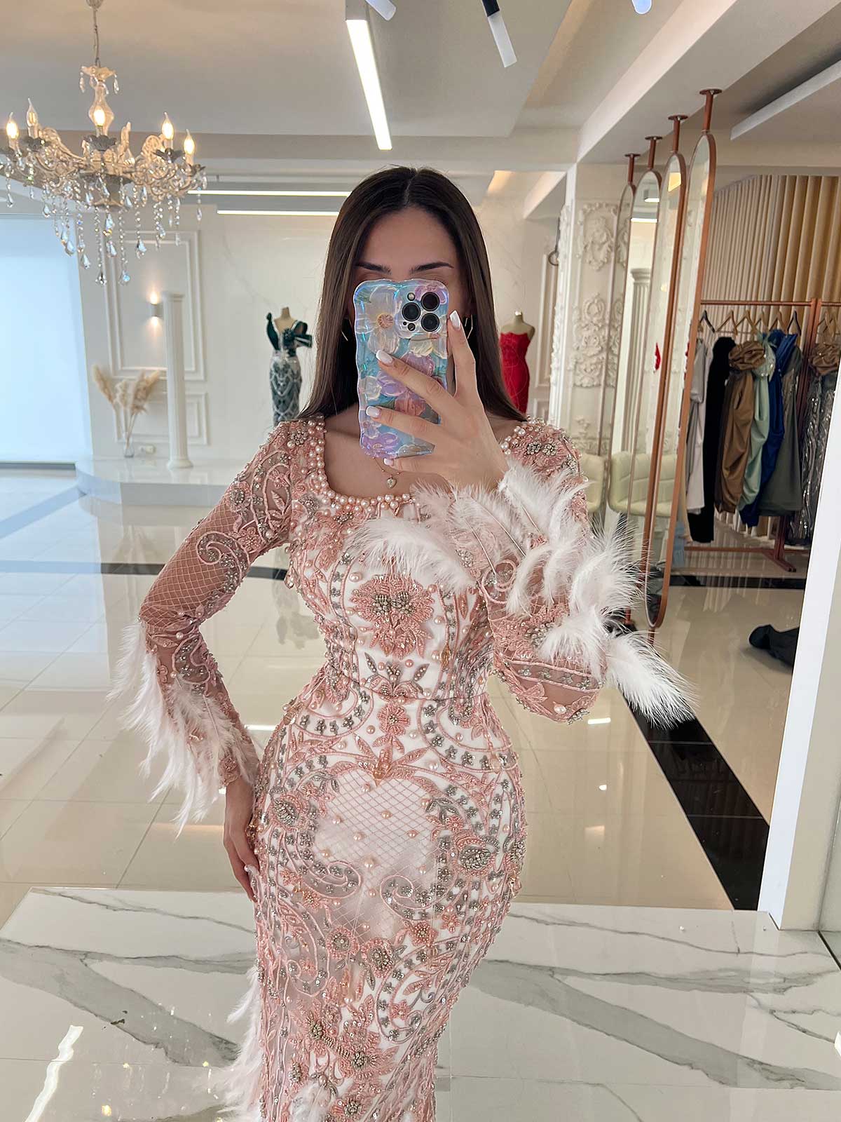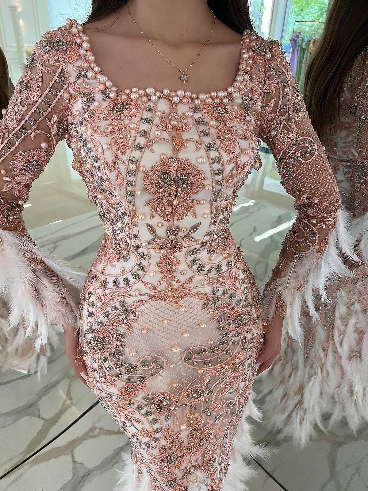 - Long sleeves with feathers