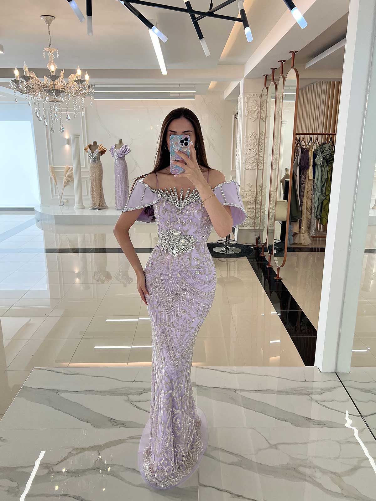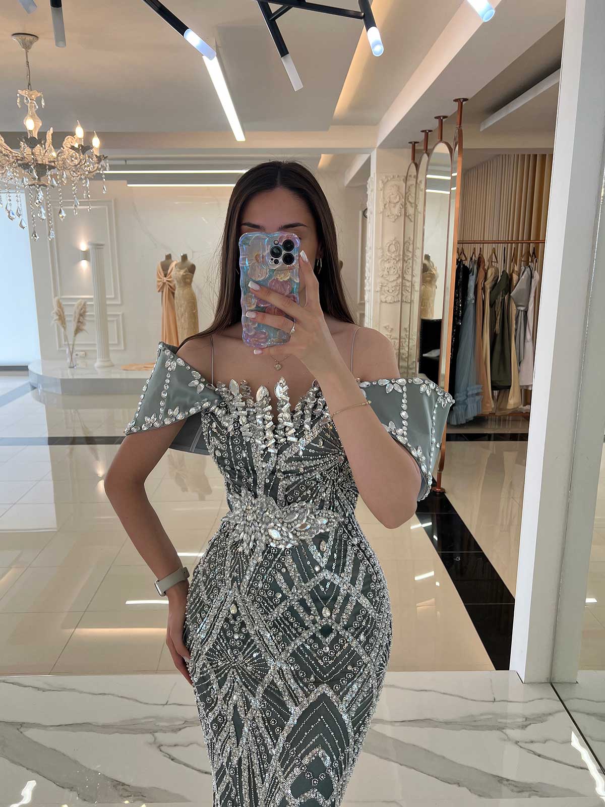 Off shoulder embroidered mermaid dress with beads and crystals.