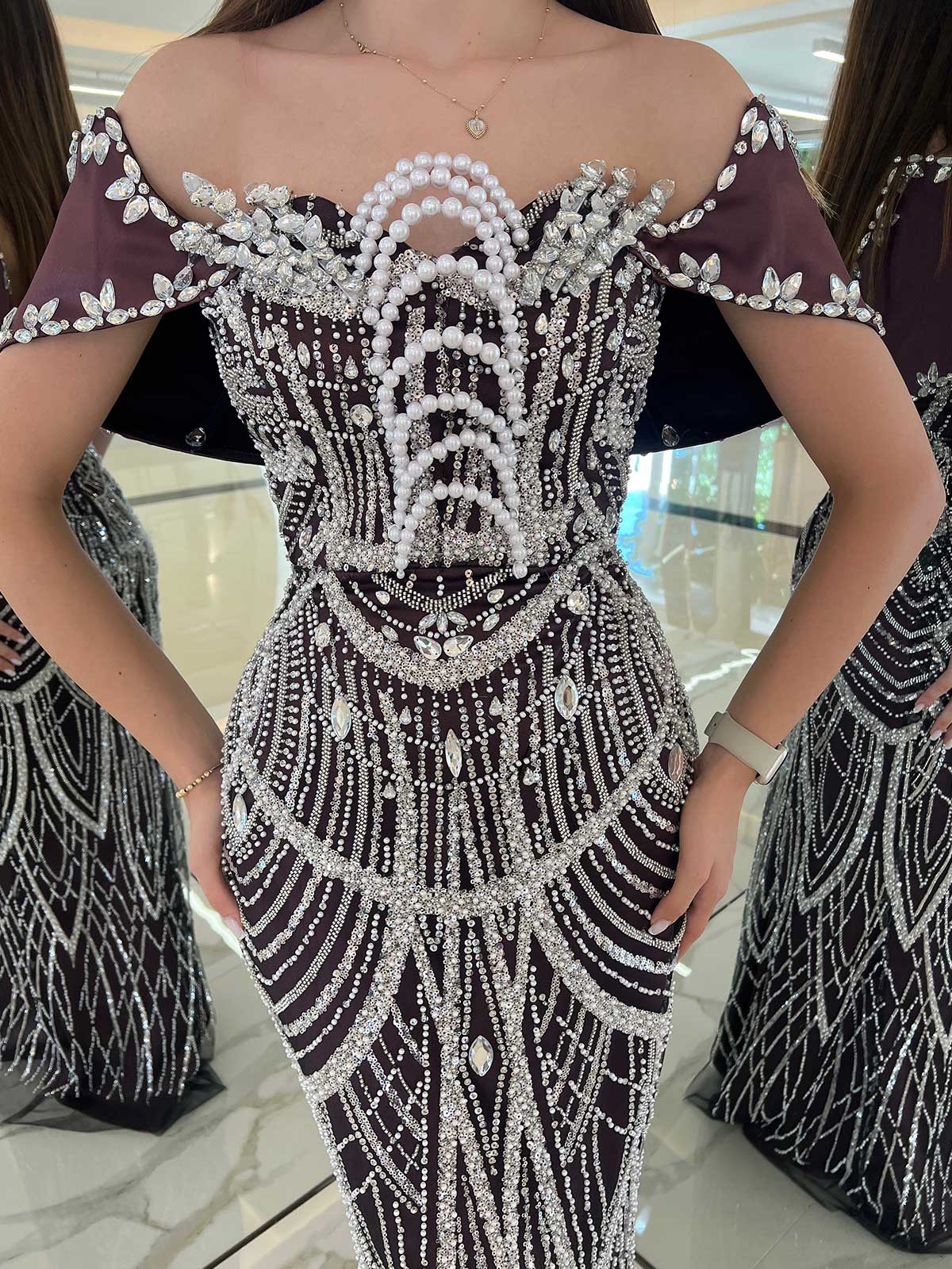 Off shoulder embroidered mermaid dress with beads and crystals.